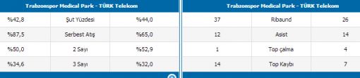 Trabzonspor Türk Telekom'a ribauntlarda 37-26 üstünlük kurarken, top kayıplarında ise Türk Telekom’dan 7 top kaybı fazla yaparak 14-7 üstünlük kurmuş oldu. Trabzonspor bu mağlubiyetle ligde 1/8 galibiyette kalırken, Türk Telekom ise aldığı bu galibiyetle galibiyet sayısını 4/4’e çıkardı.