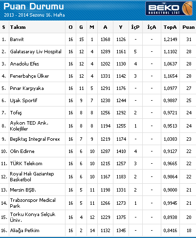 Basketbol Ligi’nde 16.hafta geride kaldı. BBL'de 16. Haftanın Ardından 29.01.2014